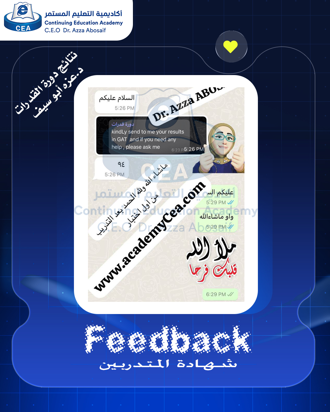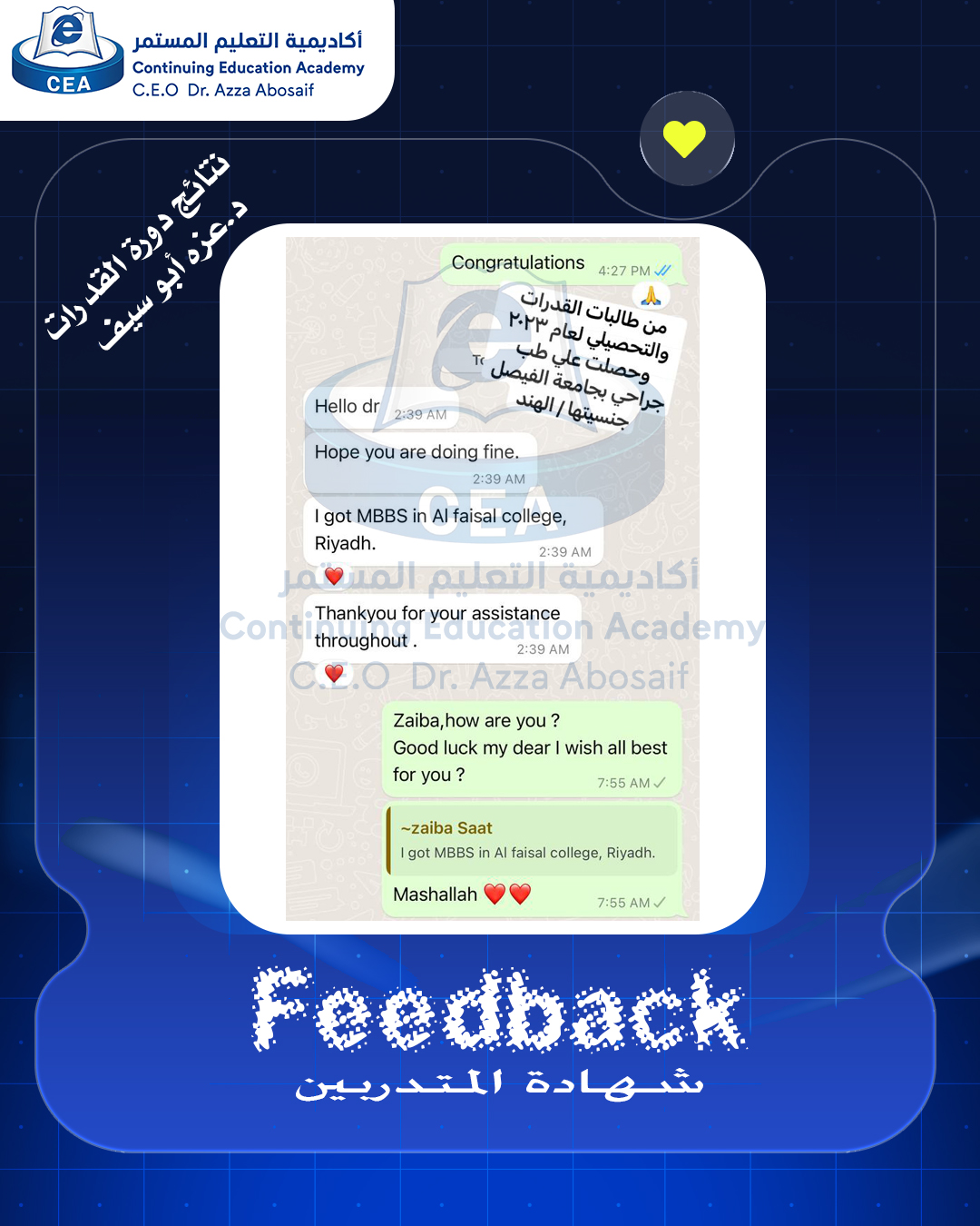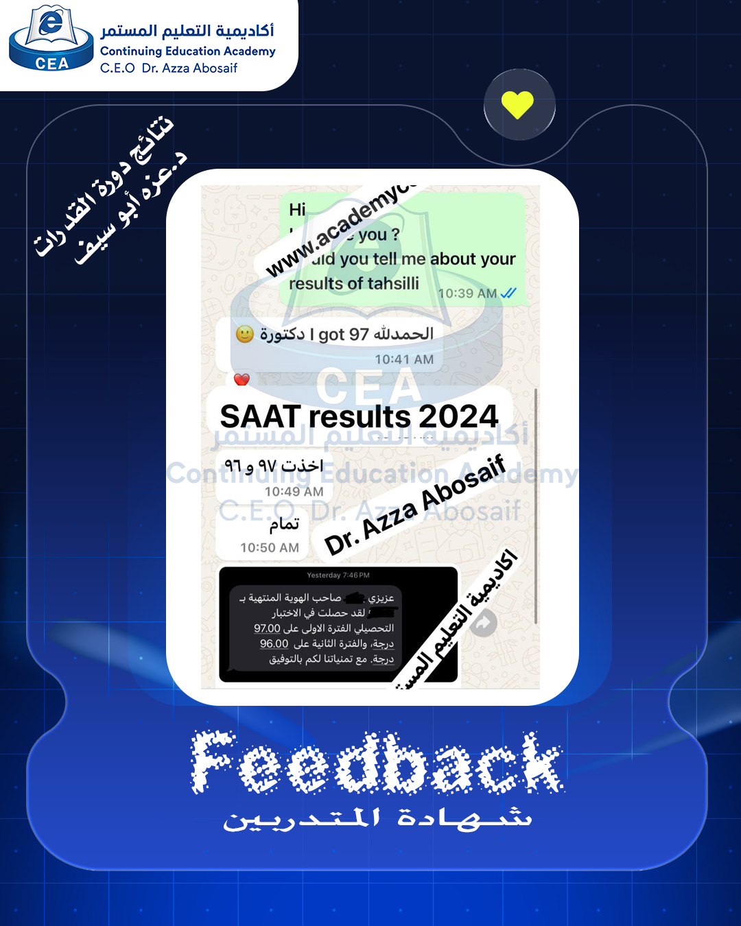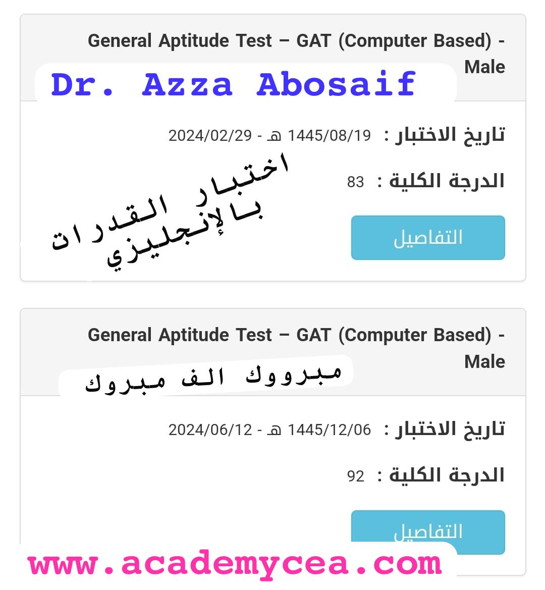 Since 2008- it has helped many students achieve the required GAT and Score levels. Join the best universities in the Kingdom of Saudi Arabia and combine with the Academy of Continuing Education. Our online training course in distinct periods, Tahsili, Welts and Languages ​​is moderated by nationals and experienced trainers Dr. Azza Abu Saif in Saudi Arabia.