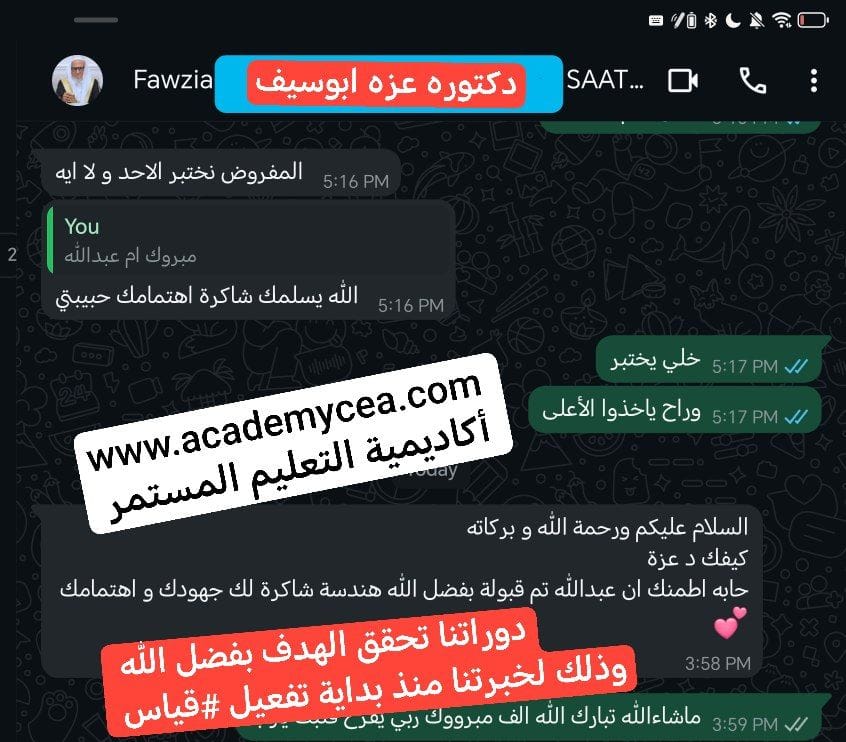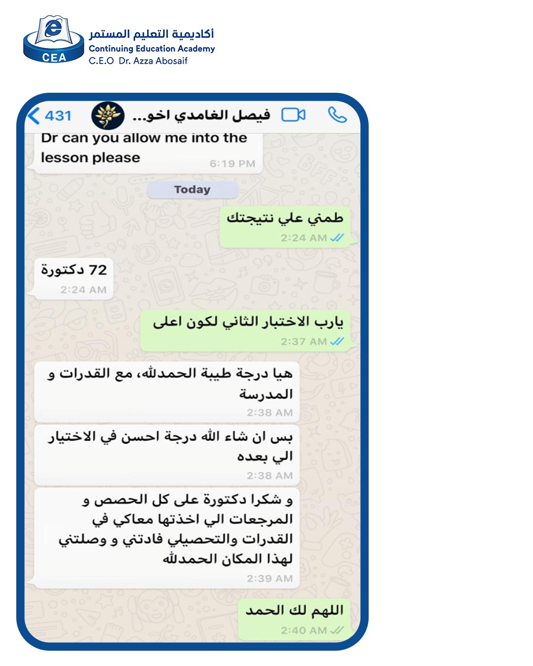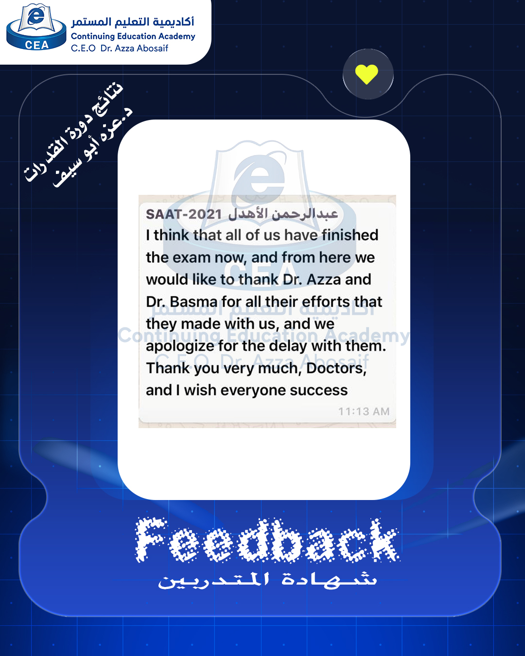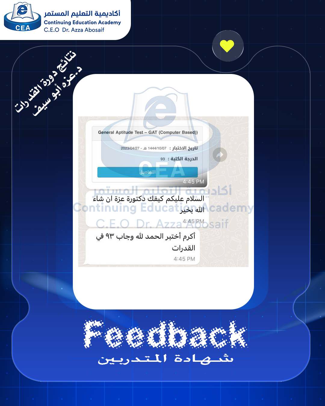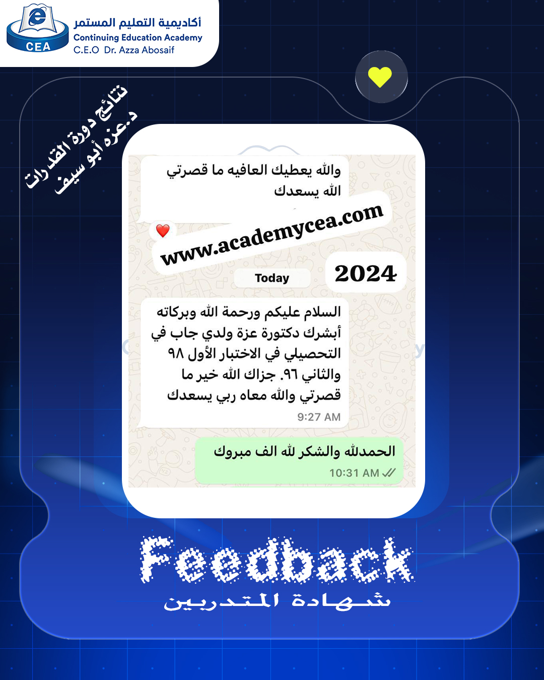 Since 2008- it has helped many students achieve the required GAT and Score levels. Join the best universities in the Kingdom of Saudi Arabia and combine with the Academy of Continuing Education. Our online training course in distinct periods, Tahsili, Welts and Languages ​​is moderated by nationals and experienced trainers Dr. Azza Abu Saif in Saudi Arabia.