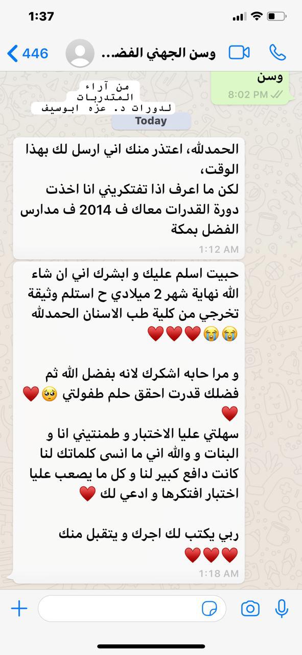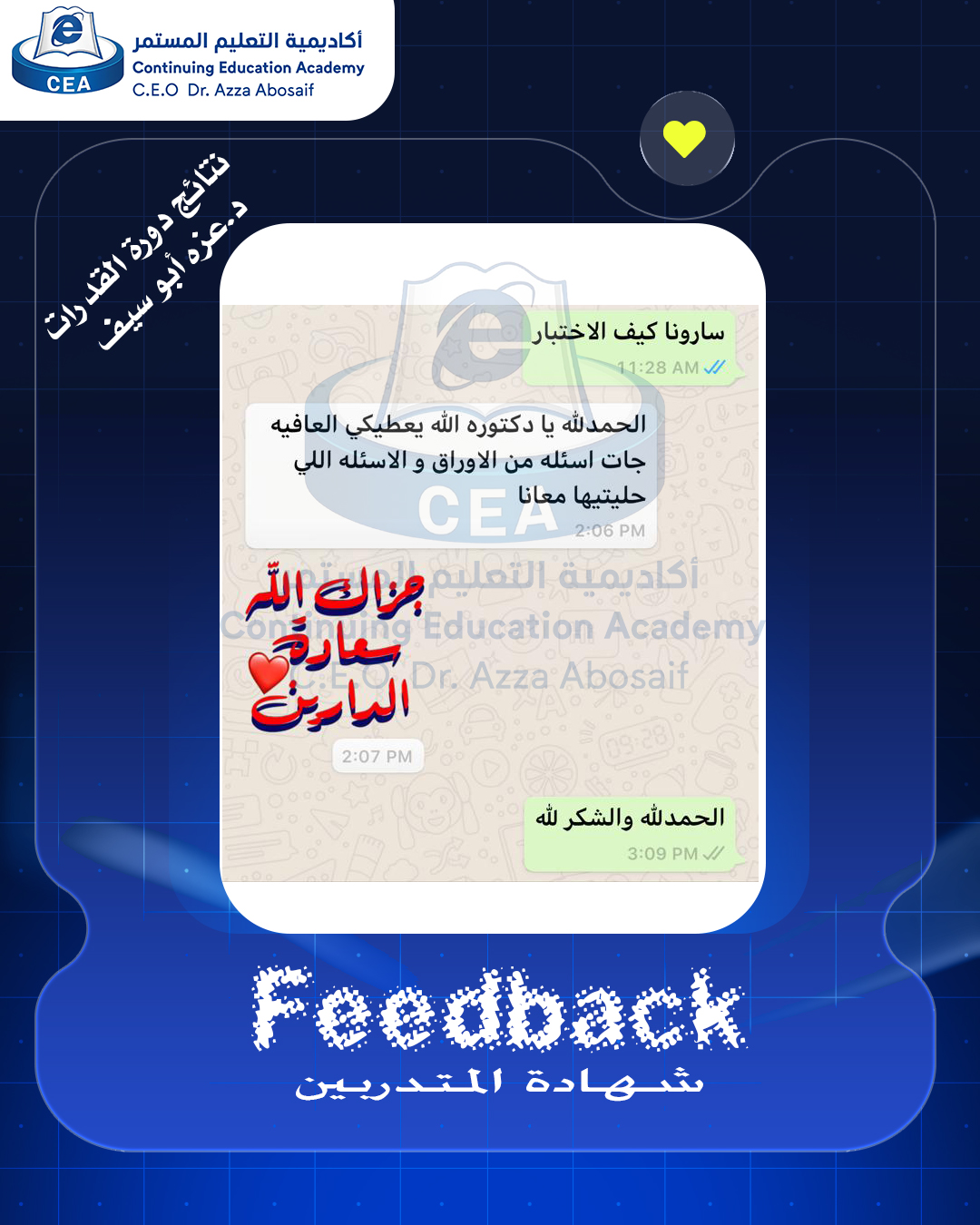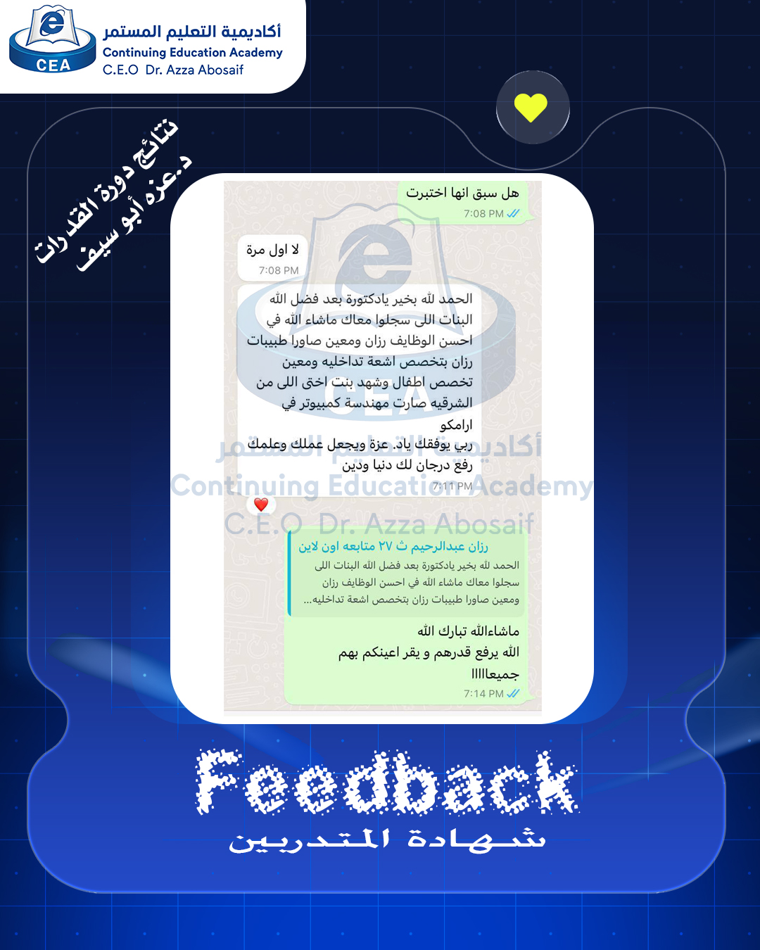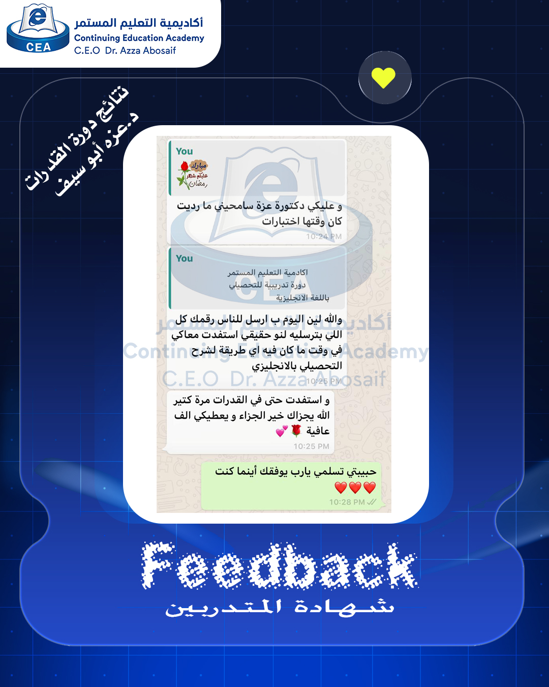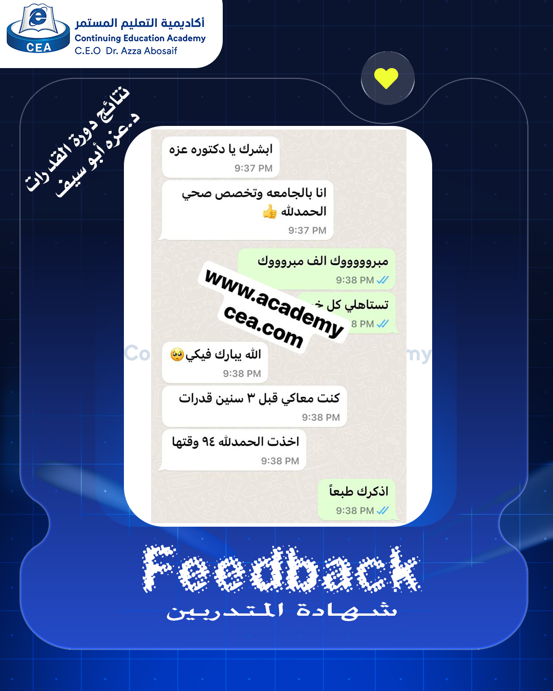 Since 2008- it has helped many students achieve the required GAT and Score levels. Join the best universities in the Kingdom of Saudi Arabia and combine with the Academy of Continuing Education. Our online training course in distinct periods, Tahsili, Welts and Languages ​​is moderated by nationals and experienced trainers Dr. Azza Abu Saif in Saudi Arabia.